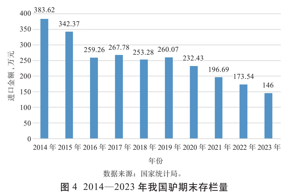 2023年末,我國驢存欄146萬頭,較上年存欄量下降15.87%。近10年來,我國驢存欄量呈現持續下降趨勢,2023年驢存欄量相較于2014年下降了237.62萬頭(圖4)。驢存欄量持續下降的原因主要有以下3方面:一是活驢功能轉化。隨著農業現代化發展,驢的功能逐漸從“役用”轉變為“肉用”,導致活驢養殖數量減少,屠宰數量不斷增加。二是市場調控失靈。近年來,驢業面臨活驢過度屠宰、母驢流失嚴重的問題,宏觀調控能力相對欠缺。三是頂層設計不夠健全。由于市場保護機制尚未完善,部分地區出現了假驢肉、以次充好等問題,加上驢產業鏈發展不夠全面、產業結構不夠完善,打擊了養殖戶從事活驢養殖的信心。