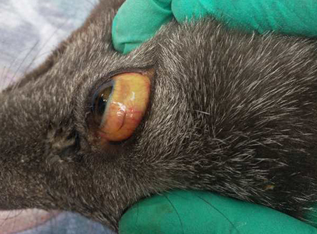 該養殖場藍狐存欄2000只,9月15日發現早窩的500只左右藍狐采食量下降,部分藍狐精神沉郁,晚窩藍狐采食以及精神狀態正常,9月19日約有200只早窩藍狐采食量急劇下降并死亡9只,9月22日晚窩藍狐開始出現采食量下降的病例并且早窩藍狐死亡數量每日遞增,筆者當天趕到該養殖場進行實地診斷。發病藍狐初期食欲下降、急性病例突然拒食,精神沉郁,體溫不高,可視粘膜(眼結膜、口腔)黃染,運動失調,腹圍增大,嚴重的病例伴有血尿和后肢麻痹,腹部尿濕等癥狀。