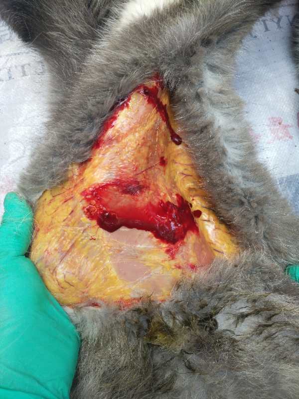 該養殖場藍狐在發病之前一直飼喂存放在冷庫里的年前購買的去膛殘雞,仔細觀察部分殘雞腹部有不同程度的發綠,這就是脂肪氧化酸敗的現象,導致黃脂肪病的發生。