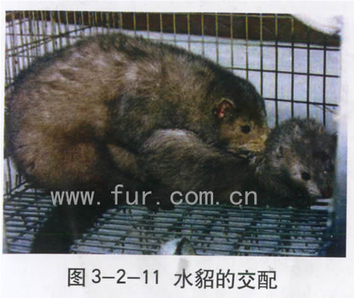 放對方法:將母貂抓至公貂籠門前,來回逗引,如果公貂有求偶表現,發出“咕咕”叫聲,即打開籠門,將母貂頭頸部送入籠內,待公貂叼住母貂頸背部后,將母貂順手放于公貂腹下,關好圖3—2—11水貂的交配