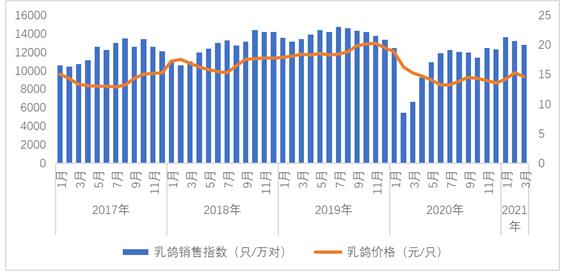 圖3 乳鴿銷售指數(shù)(只/萬對)與價格(元/只)