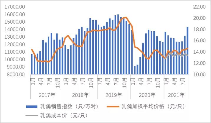 乳鴿銷售指數為14326,環比增加約9%,其波動系數為1.13,屬于較大波動。價格方面,乳鴿平均價格上漲到14.61元/只,環比增加1.5%,其波動系數為0.27,屬于一般波動。價格和銷量的雙增長提振了低迷的乳鴿市場。從結構上看,在監測企業中,銷量下滑的企業占多數,但其減幅少于增幅,減量的現象很普遍。價格表現恰好相反,價格增長的企業占多數。成本方面,近半年來,乳鴿成本基本在13.8元/只上下波動。由于價格的提升,乳鴿市場基本穩定了利潤。