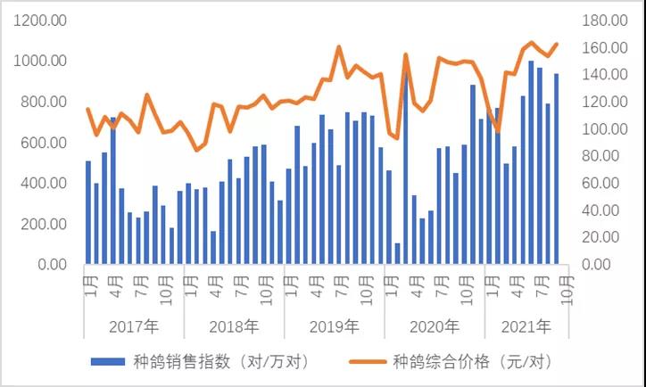 種鴿綜合價格為162.83元/對,環比增長6%,波動指數為0.26,仍為一般波動。監測企業中,2-6月齡種鴿均有,價格差距極大;其中,最高價為230元/對,最低價為45元/對。銷售方面,種鴿銷售指數為939.09,環比增加約18%。從結構上看,多數企業種鴿銷售有增加的趨勢。