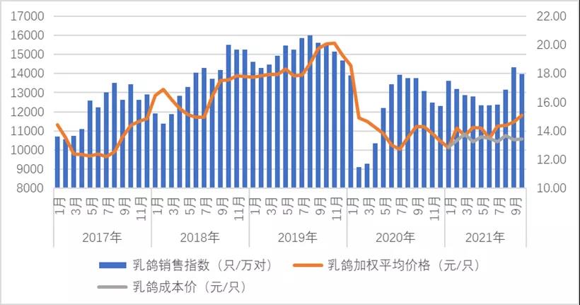 10月份,監測企業乳鴿銷售指數為13959,環比下降2.56%。從同比看,乳鴿銷量水平僅次于2018年和2019年同期。從結構看,銷量上漲和下滑的企業數量相等。價格方面,本期加權平均價格為15.11元/只,環比增加3.4%,價格波動指數為0.64,為一般波動。成本方面,監測企業乳鴿成本沒有大的變化,維持在13.42元/只的水平,如果價格上漲利潤會有所提升。總的來看,天氣轉冷,北方乳鴿成活率下降,價格有上漲的空間。
