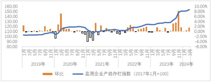 2024年3月,監(jiān)測企業(yè)產(chǎn)鴿存欄指數(shù)分別為153.44,環(huán)比上漲1.51%,為一般性波動。整體看,監(jiān)測企業(yè)產(chǎn)鴿存欄不斷上漲,穩(wěn)中有升是基本態(tài)勢。產(chǎn)能下調(diào)的企業(yè)波動幅度不大,最大降幅僅有7%,且是少數(shù)。本期,最高漲幅約為33%。