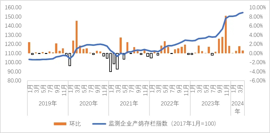 2024年4月,監測企業產鴿存欄指數分別為154.31,環比上漲0.57%,為一般性波動。整體上,監測企業產鴿存欄穩中有升。結構上看,本期最高漲幅為22%,個別企業下調幅度為2%
