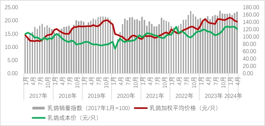 4月份,監測企業乳鴿價格分別為19.57元/只,環比下降2%;乳鴿價格環比波動指數為0.44,為一般性波動。本期乳鴿價格區間為16-25元/只。銷量方面,本期乳鴿銷量指數分別為168.65,環比波動指數為0.13,也為一般性波動。成本方面,受產量上漲影響,本期乳鴿中鴿成本價分別為16.84元/只,環比下降4%,利潤約為2.71元/只。如果考慮到鴿蛋收益,利潤接近4.46元/只。