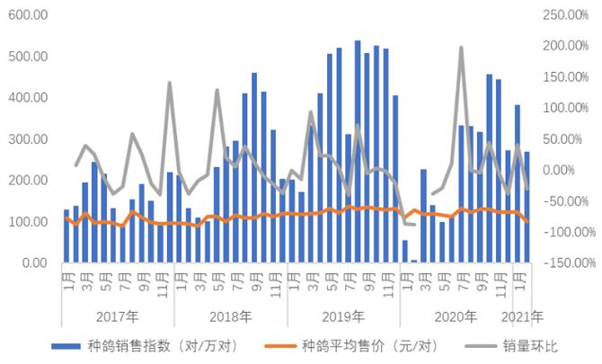 1、2月份種鴿銷量指數(shù)(萬對產(chǎn)鴿的種鴿銷量數(shù))分別為382和270,環(huán)比分別增加40%和-30%。從結(jié)構(gòu)性看,1月份的銷量上升是少數(shù)企業(yè)的大幅調(diào)整改變了穩(wěn)中有降的整體趨勢;2月份的季節(jié)性特征相對明顯,極少數(shù)的企業(yè)種鴿銷量上升,而大部分的企業(yè)銷量呈大幅下降的趨勢。另外,本期1-2月種鴿相對銷量指數(shù)要好于往年同期。2017-2019年該指標最高不超過220,2020年因為新冠肺炎疫情的影響,銷量更是降至冰點。銷量增加的同時價格卻處于較低水平。2月份,種鴿價格環(huán)比下降約19%,創(chuàng)下了近4個月的最大跌幅,最低為36元/對。