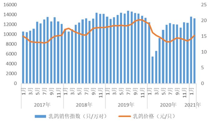 1、2月份乳鴿銷量指數(shù)(萬對產(chǎn)鴿的乳鴿銷售數(shù))分別為13609和13232,環(huán)比分別增加10.54%和-2.77%。從結(jié)構(gòu)性看,1、2月份乳鴿銷量均有增有減,各地差異較大。另外,本期1-2月乳鴿銷量指數(shù)與2019年相當(dāng),并明顯好于2017以來的其他年份。價格方面,1-2月份,乳鴿價格環(huán)比增加4%和8%,2月份監(jiān)測企業(yè)的價格區(qū)間提升至11-20元/只,平均價格為15元/只,但與往年同期相比仍處于較低水平。