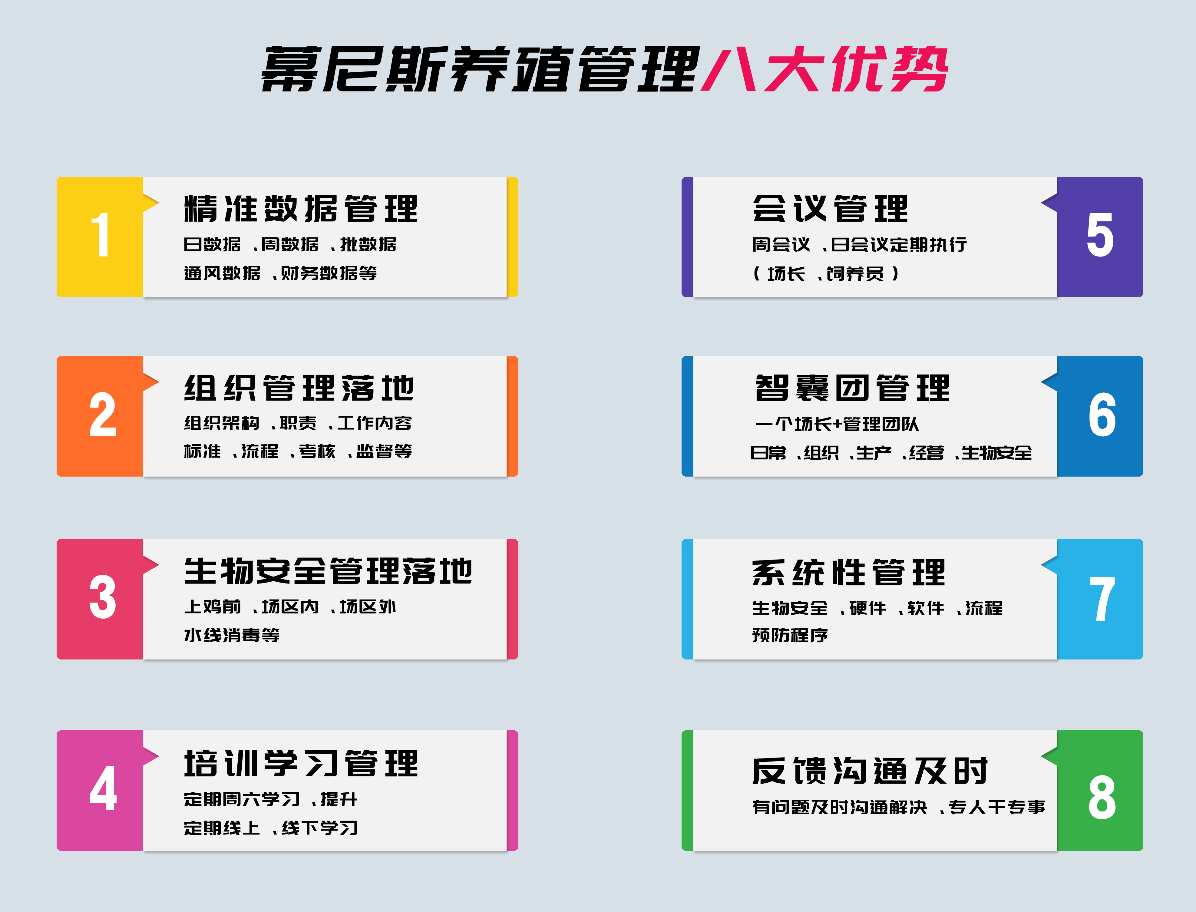 公司成立以來,以科技為本,堅持理論聯系實際,秉承“做精細化管理,創養殖高效益”的經營理念。通過對規模化養殖場提供系統管理,開創了精細化1258管理系統,精細化36524操作流程,精細化37112保健方案,被業內同仁稱為“幕尼斯精細化管理模式”。