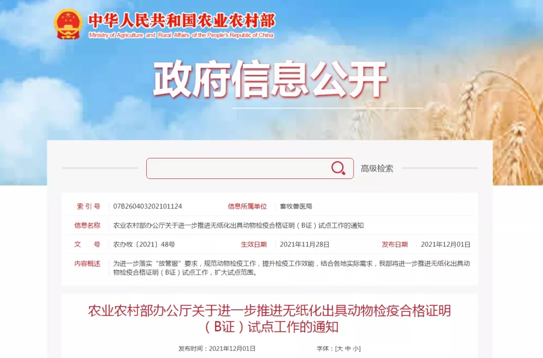 農業農村部關于進一步推進無紙化出具動物檢疫合格證明(B證)試點工作的通知