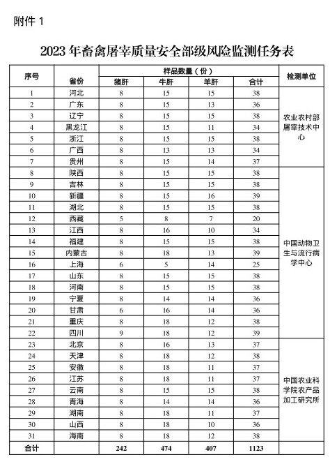 1. 2023年畜禽屠宰質量安全部級風險監測任務表