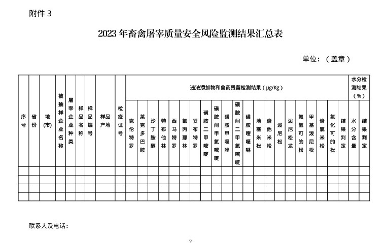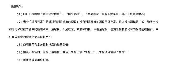 屠宰技術中心負責部級監測和省級監測數據的匯總與分析工作。部級監測承檢機構和省級農業農村主管部門分別于6月25日、12月25日前將上半年、全年監測結果匯總表(附件3)和監測結果分析報告加蓋公章后報屠宰技術中心。