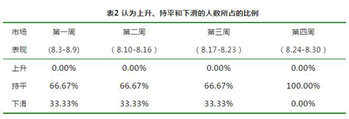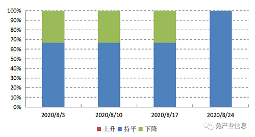根據8月份集散地監測結果,對于市場的未來走勢,大部分商戶持中立的態度。在8月份的四周中,沒有商戶認為銷售情況會上升,75.00%的商戶認為銷售情況會保持現狀,25.00%商戶認為市場表現會下降,商戶總體態度中性偏消極(表2)