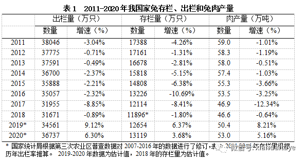 2011-2020年我國兔出欄、存欄和兔肉產量