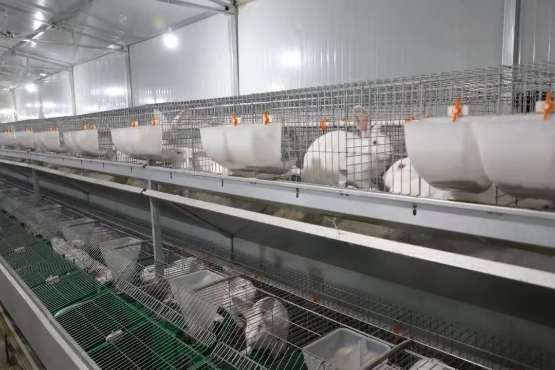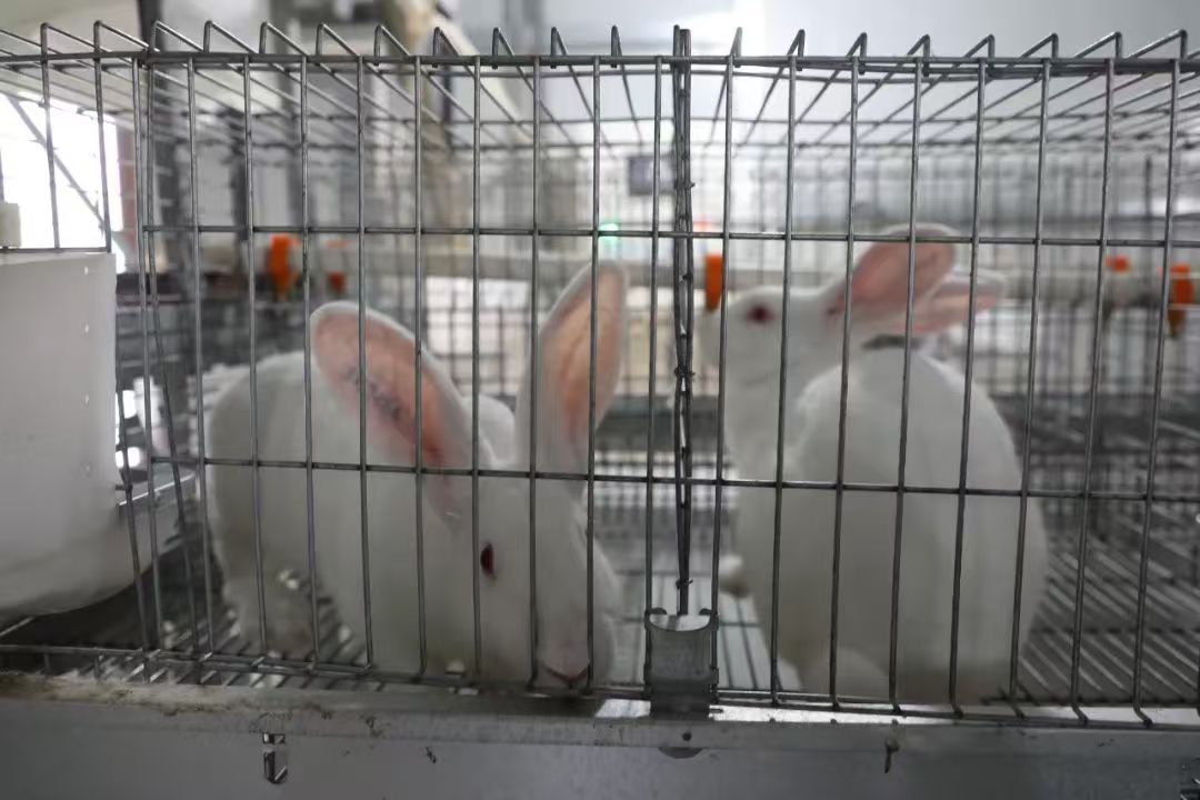 走進(jìn)養(yǎng)殖基地,一排排整齊的兔舍映入眼簾。籠內(nèi)一只只雪白的、毛茸茸的兔子圓滾可愛,有的在悠閑地進(jìn)食,有的在瞇眼打盹,有的興奮地豎起耳朵四下張望,工作人員正熟練地加食、加水、清理糞便。