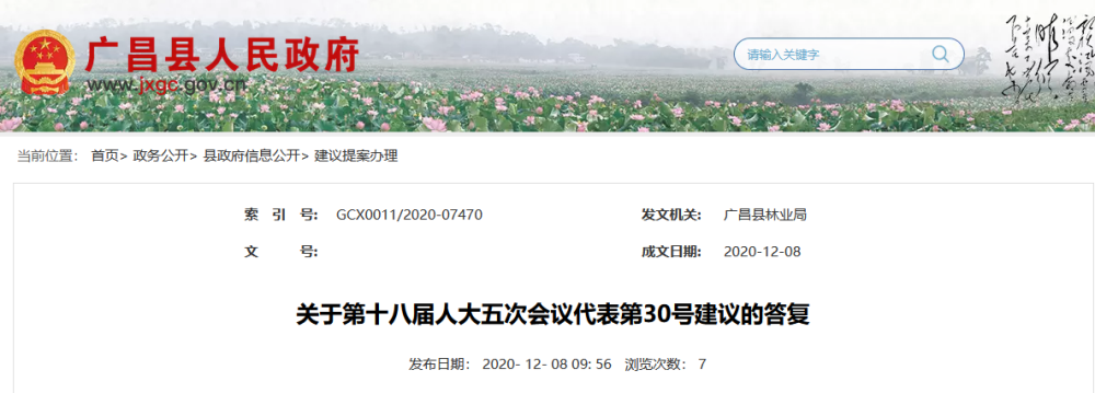 12月8日,廣昌縣林業局通過廣昌縣人民政府官網公布了《關于第十八屆人大五次會議代表第30號建議的答復》。