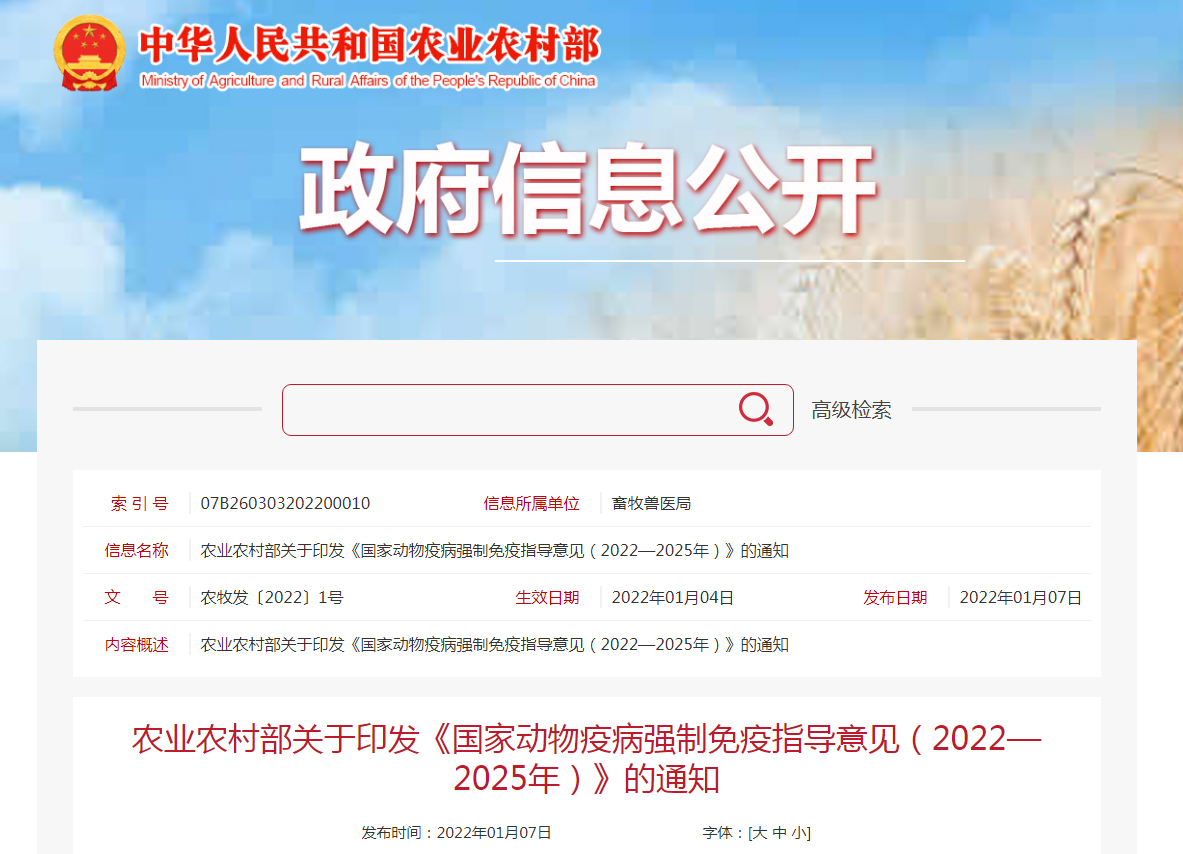 為切實做好全國動物疫病強制免疫工作,根據《中華人民共和國動物防疫法》規定,結合當前動物防疫實際,我部制定了《國家動物疫病強制免疫指導意見(2022—2025年)》?,F印發你們,請遵照執行。