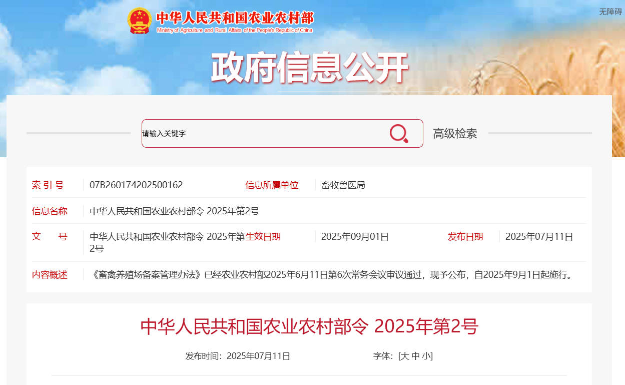 《畜禽養(yǎng)殖場(chǎng)備案管理辦法》已經(jīng)農(nóng)業(yè)農(nóng)村部2025年6月11日第6次常務(wù)會(huì)議審議通過(guò),現(xiàn)予公布,自2025年9月1日起施行。